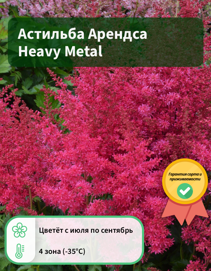Саженцы Астильбы Арендса Хеви Метал (Heavy Metal) принадлежат сортовой серии «Музыка». Цветущее растение подарит цветнику буйство красок, зарядит энергией. Крупные пышные метелки достигают 30 сантиметров в длину, при общей величине цветоноса в 70 сантиметров. Цвет соцветий вишнево-красный, насыщенный. Распускается многолетник в июле, цветение длится около 5 недель.