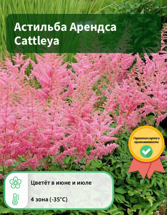 Рассада астильбы «Каттлея» (Cattleya) хорошо переносит морозы. Только если будет мало снега, то тогда могут подмерзнуть молодые побеги. Поэтому в этом случае растение лучше накрыть. Высаживают рассаду астильбы «Каттлея» в любую почву, хорошо удобренную навозом, перегноем или торфом. Если на участке высокий уровень грунтовых вод, то цветок хорошо с этим справляется. Хорошо освещенные участки для этого растения не подходят. Семена астильбы «Каттлея» лучше высевать в полузатененные места. Высота растения около 80 см. Цветение приходится на июль. Тогда появляются соцветия розового цвета.
