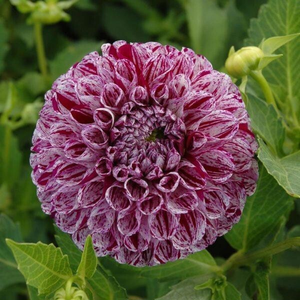 Луковицы георгины махровой Марбл Болл (Marble Ball, DÁHLIA VARIABILIS) дарят жизнь цветку, красоту которого сложно передать словами. Царское растение насыщенного фиолетового цвета по краям с белым отливом. Каждый лепесток свернут в трубочку, формируя пышный бутон. Цветет непрерывно с июня по сентябрь. Куст высотой от 60 до 100 сантиметров усыпан крупными бутонами до 12 сантиметров в диаметре. Аромат приятный, но слабый. Каждый бутон радует свежестью около 20 дней, после него появляются другие, не менее привлекательные. Любит хорошо удобренную почву, солнце, отсутствие ветра.