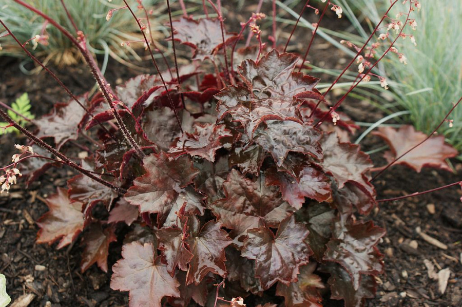 Рассада гейхеры Блэкаут (Blackout) – отличный вариант для дополнения смешанных посадок, декорирования искусственных водоемов и оформления альпийских горок. Многолетник с темно-пурпурной листвой и бело-розовыми цветочками украсит любой садовый объект. Особенностью сорта является блестящая поверхность листьев.