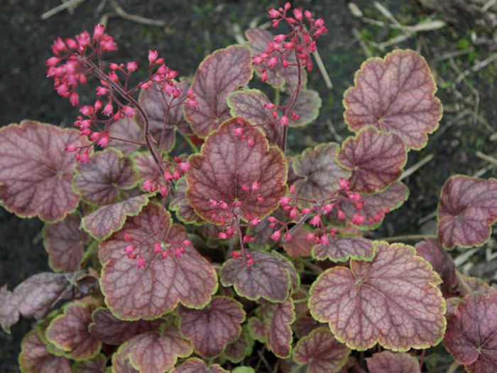 Рассада гейхеры Мастер Пеинтер Пикассо (Master Painter Picasso) порадует невероятно красивой окраской. По краям янтарно-бордовых листьев имеется золотистая каемка, а на поверхности проступают темные прожилки. Во второй половине лета среди листвы появляются высокие цветоносы с кремовыми соцветиями.