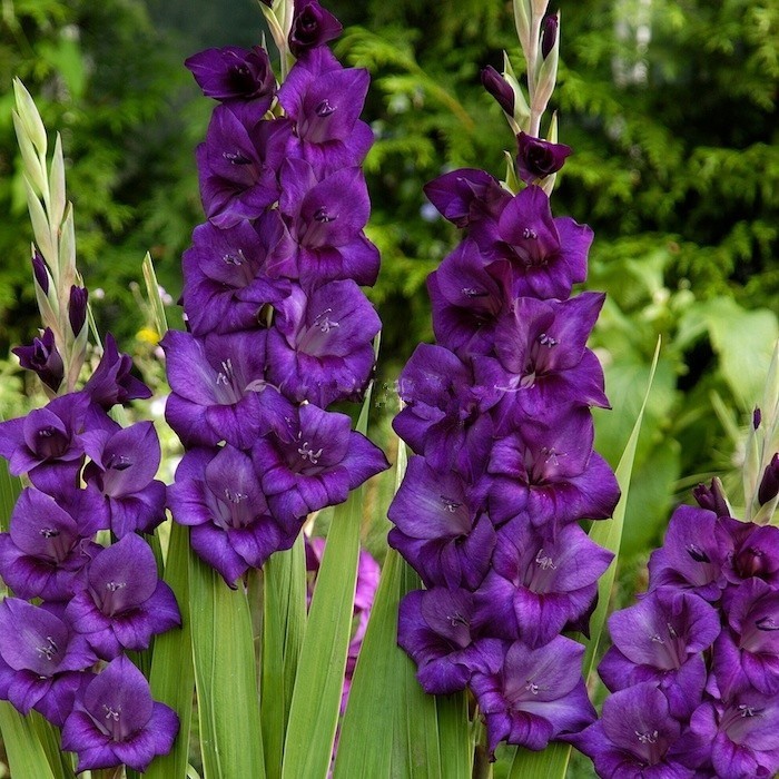 Луковицы гладиолуса гибридного Purple Flora лучше всего растут в почве с богатым содержанием гумуса. Место рекомендуют выбирать солнечное или слегка притененное, защищенное от сквозняков, без застоя влаги. Цветок вырастает до 120-150 см в высоту. Период цветения наступает в конце июня. Цветки темно-фиолетовые, красиво переливаются на солнце. Они собраны в одностороннее колосовидное соцветие по два ряда. Одновременно распускается от 6 до 8 цветочков. Цветет гладиолус гибридный Purple Flora до сентября.
