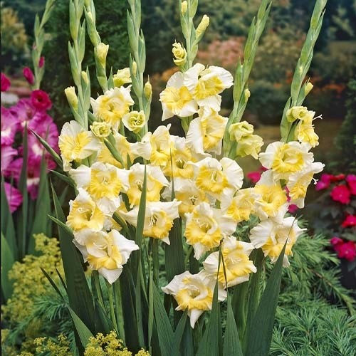 Гладиолус крупноцветковый сорта Buggy - это настоящее воплощение летнего волшебства в вашем саду. Его желтые центральные лепестки, дополненные белыми нижними, создают неповторимую атмосферу радости и тепла. Высота растения достигает 80-110 см, а размер цветка составляет 8-10 см. Гладиолус Buggy идеально подходит для газонов, групповых посадок, миксбордеров или одиночных посадок.