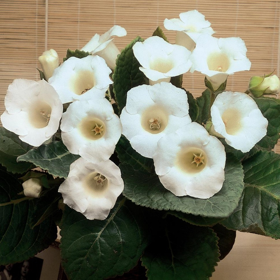 Клубни глоксинии Монт Бланк (Mont Blanc) – бюджетный способ и возможность вырастить самостоятельно красивое горшечное растение с высокими декоративными свойствами. Посадить их нужно в невысокие широкие горшки с рыхлой плодородной почвой. Сорт быстро наращивает зеленую массу. Высота кустика достигает 20 сантиметров. Листья крупные, бархатистые, насыщенно-зеленого цвета. На их фоне прекрасно смотрятся огромные трубчатые бутоны, образованные из пяти сросшихся белоснежных лепестков. Цветение непрерывное и продолжительное, с марта по октябрь. После этого наземная часть растения отмирает, а клубни зимуют в почве до весны.