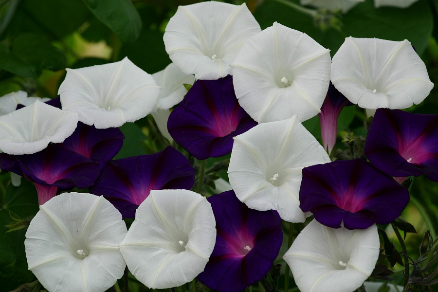 Ипомея "Танец теней" - это удивительное растение с темно-фиолетовыми и белыми цветками, которое поражает своей красотой и изяществом. Его стебель достигает диаметра до 8-10 см, а время цветения приходится на март, апрель, июнь и июль. Листья имеют форму сердца и создают неповторимый образ этого растения.
