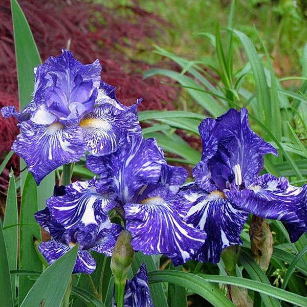 • цветет с июня по июль. Цветок ириса германского Батик отличается сине-лиловыми лепестками с многочисленными белыми брызгами и такой же бородкой. Семенами размножается трудно, более предпочтительный вегетативный способ. В групповых посадках прекрасно сочетается с белыми и синими цветами. Благодаря крупным цветкам и высоким стеблям часто используется на срезку в букеты.