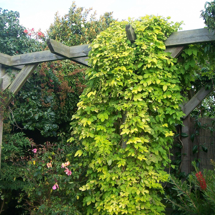 Humulus lupulus Aureus (Ауреус) - сильно-растущий многолетник с шероховатыми, вьющимися побегами. Дорастает в течение года до 6 м высотой, а растение может разрастаться до ширины 2-3 м, образуя в течение нескольких недель золотистую волну побегов и листьев. Надземные побеги хмеля отмирают каждую осень, а весной вырастают новые из подземной части растения. Листья крупные, глубоко-лопастные (как у винограда) зубчатые, шершавые, желтые весь вегетативный сезон. Хмель является двуполым растением, а сорт Aurea женский клон, поэтому осенью покрывается желтыми шишками.