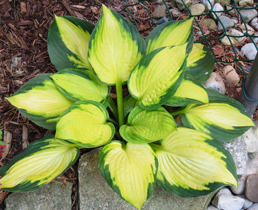 Хоста сорта Georgia Sweetheart (Джорджия Свитхарт) высота хосты Джорджия Свитхарт 45-50 см, ширина до 60 см. Главным достоинством являются крупные листья, которые придают ей особый очарование. Листва плотные, гладкие, окрашены в желтовато-оранжевый цвет с темно-зеленой каймой.