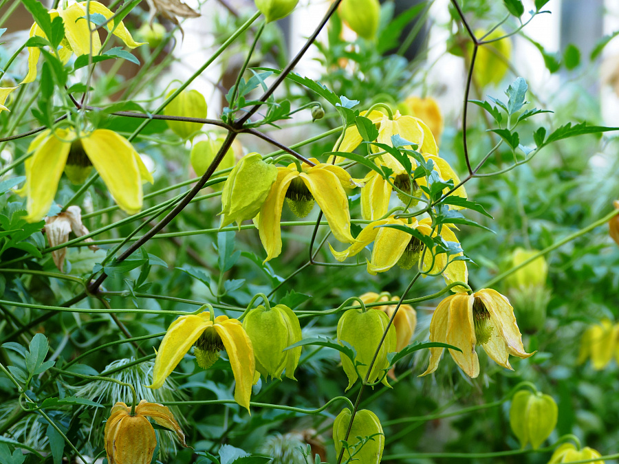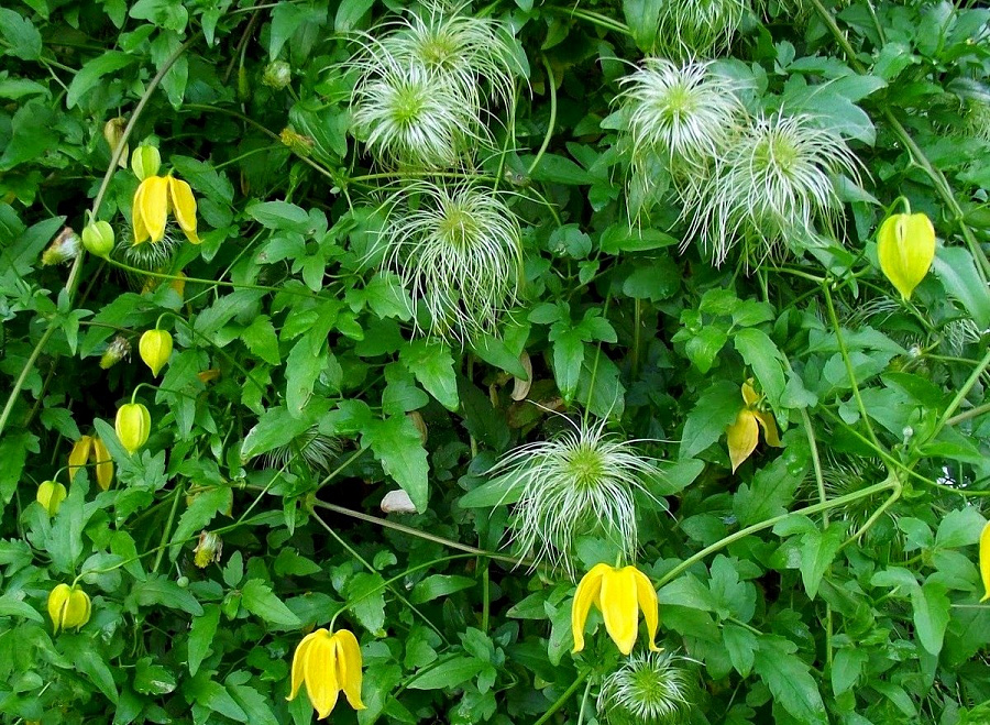 Саженцы клематиса Тангутского (Clematis tangutica) малотребовательны к условиям выращивания. Хорошо зимуют, переносят засуху и полутень. На открытых солнечных местах лиана быстро разрастается. Длина лиан достигает 250-300 см. Саженцы рекомендуется высаживать вдоль ограждений, решеток, стен и других объектов, способных послужить опорой. Цветет клематис тангутский (Clematis tangutica) с конца весны до самых заморозков (июнь-сентябрь). Цветки поникающие, желтого цвета, диаметром до 5 см. По окончании цветения, растения не теряют декоративность, на лианах появляются пушистые светлые соплодия.
