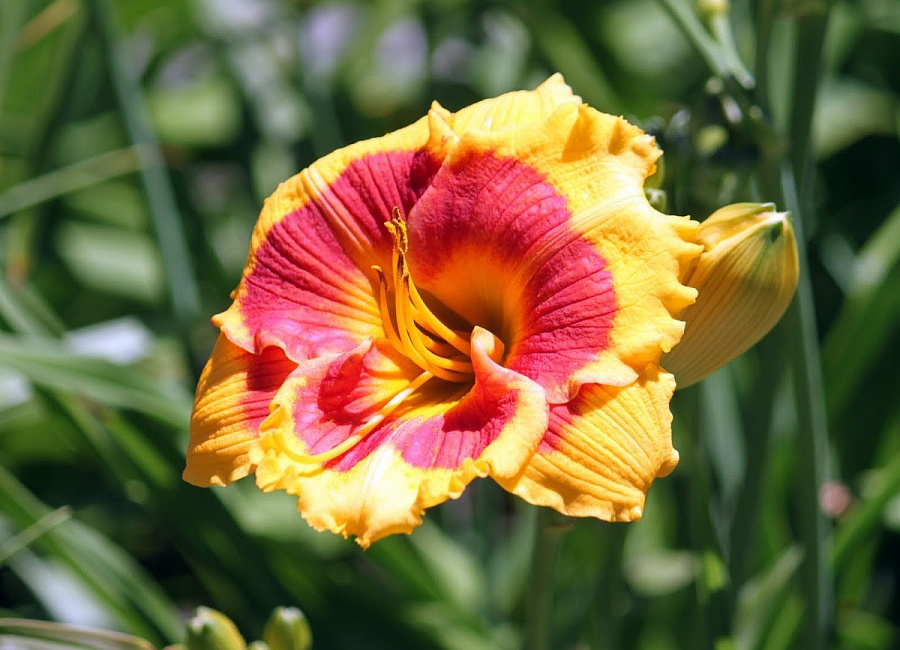 Окраска цветка : ярко-жёлтый с красным глазком и зелёным горлом