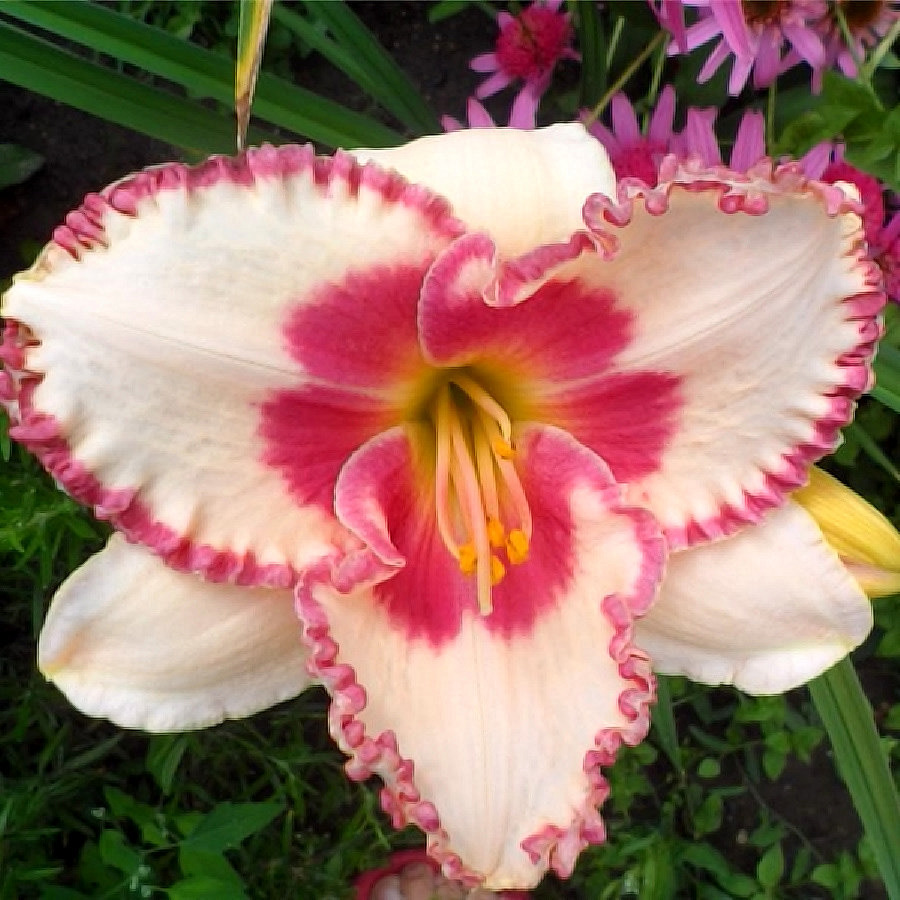• Окраска цветка : кремово-жёлтый с красной окантовкой и глазком, горло зелёное