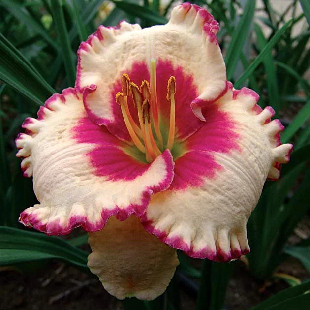 Лилейник Эйджлес Бьюти (Ageless Beauty) –многолетнее травянистое растение с компактно растущим корневищем. Площадь разрастания небольшая, образует мощный куст, ежегодно увеличивающийся в объеме. Размер взрослого растения 60-70 см. Время цветение раннее. Период цветения конец июня, июль. Сорт относится к крупноцветковым лилейникам. Цветок обладает приятным ароматом. Окрас кремовый, глазная зона и гало красного цвета. Текстура цветка гофрированная. Это растение хорошо подходит для солитерных посадок. Сажать рассаду требуется на хорошо освещенное, солнечное место.