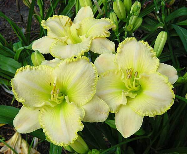 Рассада лилейника Фест Найт (First Knight) придется по душе тем цветоводам, которые ценят простоту и элегантность. Растение цветет крупными бутонами по несколько штук на одном стебле, создавая своеобразный букет. Цвет лепестков имеет нежно-желтый оттенок, а по краю идет обрамление гофрированной золотистой каймой. Многие оценят достоинства этого превосходного сорта: