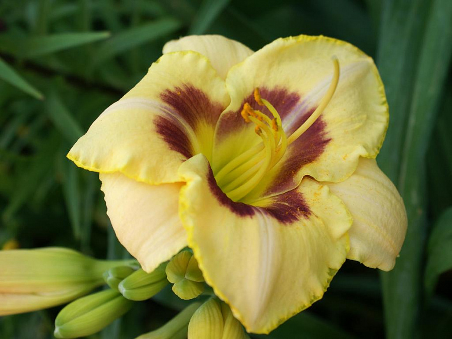 • Окраска цветка : Кремово-желтая с темно-бордовым центром и зеленым горлом