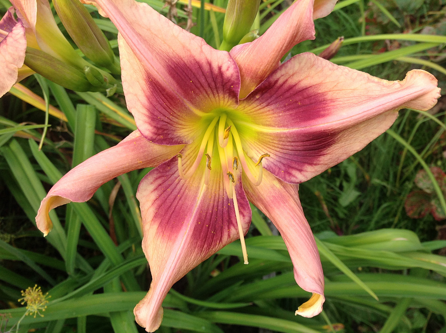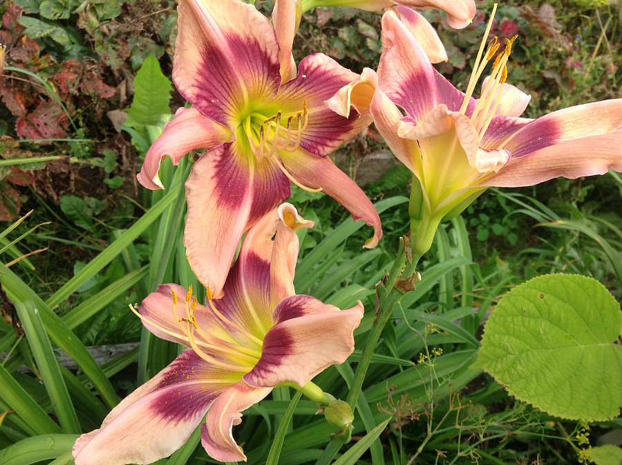 • Окраска цветка : розово-абрикосовая с желтым центром и фиолетово-лилвым кольцом