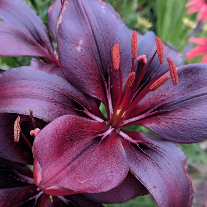 • Окраска цветка : Лепестки околоцветника тёмно-бордовые с иссиня-темным пятном в центре, глянцевые, широкие, со слегка загнутыми кончиками
