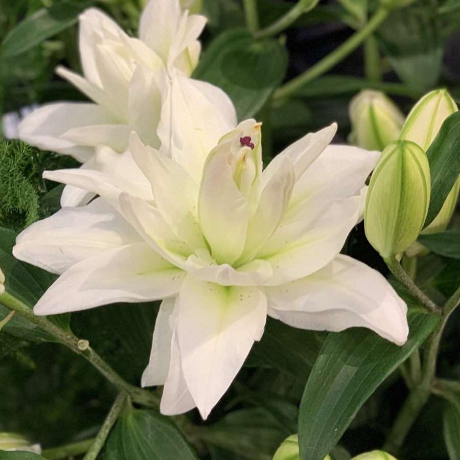 Лилия азиатская махровая сноуборд - это великолепное растение, которое поразит вас своей красотой и изысканностью. Ее стебель достигает высоты до 85 см, а цветки белоснежного цвета с нежными розовыми крапами и мазками по краям лепестков радуют глаз размером до 20 см. Листья лилии имеют уникальную форму, что делает это растение еще более привлекательным.