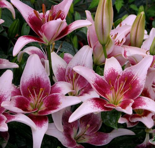 Лилия азиатская "Танго Строберри энд Крим" - это воплощение нежности и изысканности в вашем саду. Ее стебель прочный и изящный, достигает высоты до 120 см, украшенный крупными цветками диаметром 10 см. Листья лилии имеют ярко-зеленый оттенок, создавая контраст с розово-пурпурными цветами.