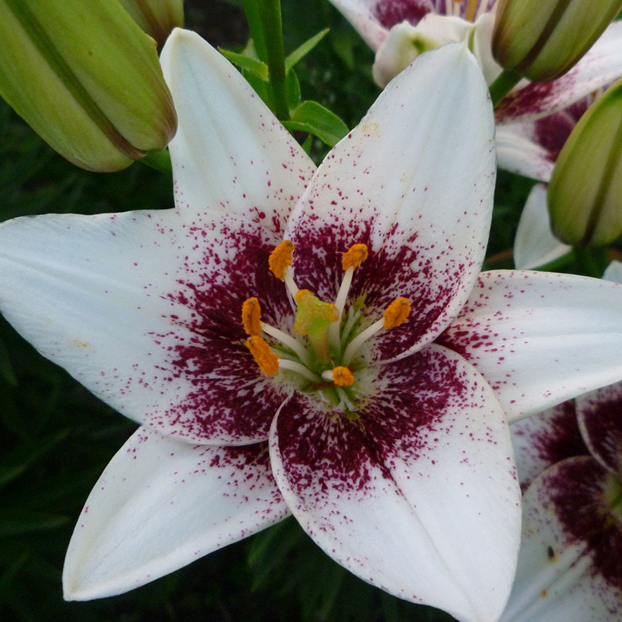 Окраска цветка : белый с густым вишневым крапом до середины лепестков