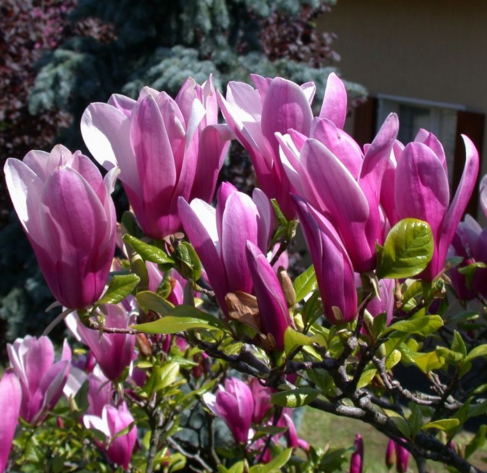 Саженцы магнолии гибридной вырастут в раскидистые листопадные растения с множеством изумительных крупных цветов. Взрослые растения принимают форму кустарника или дерева, высотой до 2-3 м. Крупномеры зацветают в середине весны, цветение обильное и длится достаточно долго. Цветы имеют форму чаш, с продолговатыми нежными лепестками, и распространяют приятный аромат. Листья овальные, вытянутые, темно-зеленого цвета. Крона молодой магнолии гибридной принимает форму конуса, затем разрастается в ширину.