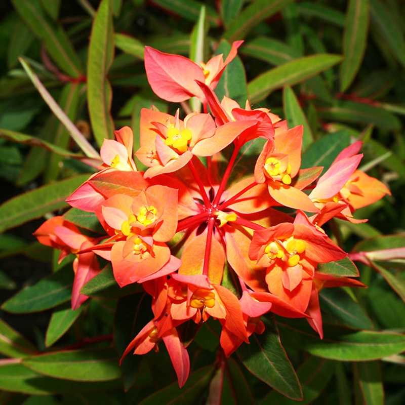 Рассада Молочая Гриффита Файрглоу (Fireglow) травянистое растение до 80 см высоту с огненно красными соцветиями. Цветение продолжается длительное время, начиная с июня. Особенно выигрышно цветы будут выглядеть на солнце. Сорт может пережить зиму с морозами до –23 градусов. В сезон Файрглоу хорошо ведет себя и на солнце, и при частичном затенении. Выбор почвы не принципиален, но больше подойдет легкая и удобренная земля. Растение прекрасно дополняет ландшафты в садах, а также хорошо смотрится среди разреженно посаженных деревьев. Оно подойдет для создания бордюра и оформления дикого уголка в саду.