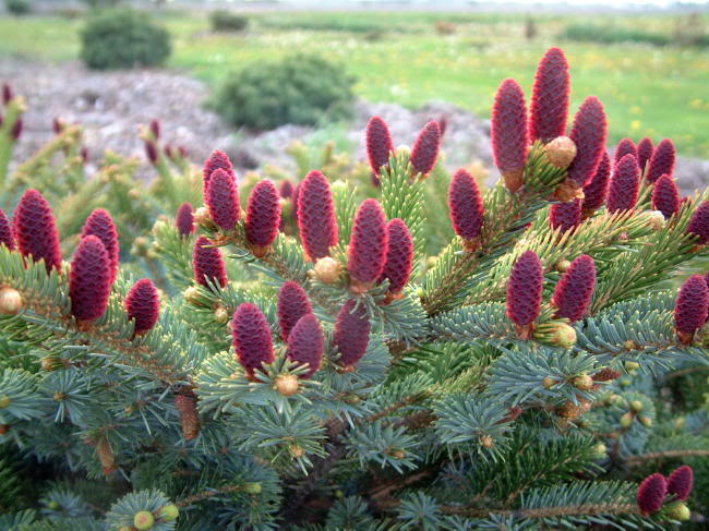 Саженцы Ели двуцветной (Picea bicolor) – это медленнорастущее зеленое дерево с конусовидной формой и выраженной острой верхушкой, у которого ветви растут уже от низа. За первые 10 лет ель вырастает на 250 сантиметров в высоту и 70 сантиметров диаметром. Длина четырехгранной, острой, дугообразной хвои примерно 1-2 сантиметра. Поверх хвоя обычно зеленая, а внизу она голубой. Ель двуцветной имеет исключительно красивый контраст хвои, когда это растение уже немолодое и вырастает до 300 сантиметров. Голубой цвет преобладает у молодых растений. Дерево предпочитает полутенистые места и в меру влажный грунт.