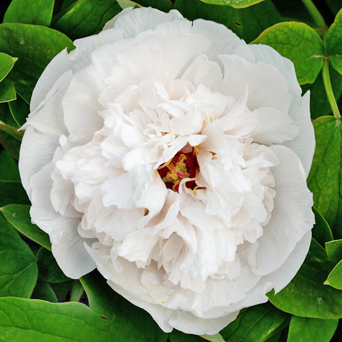 Пион древовидный Снежная Пагода - цветки белые, корончатой формы, 16 см в диаметре. Куст сильнорослый, высото 120-150 см. Морозоустойчивый кустарник, достигающий высоты до 2 м, с крупными ярко-зелеными листьями. На одном кусте может быть от 30 до 70 цветков. Диаметр каждого от 20 до 25 см. Продолжительность цветения 12—14 дней. Растение декоративно и после цветения из-за необычной формы листьев. Пион неприхотлив, устойчив к болезням. На одном месте без пересадки может расти более 20 лет.