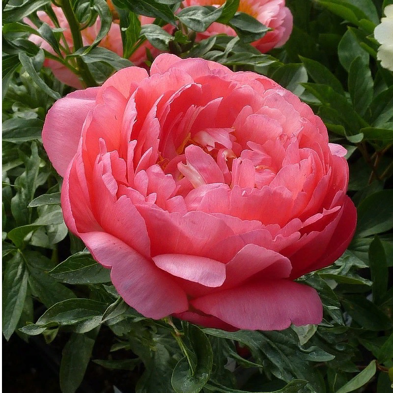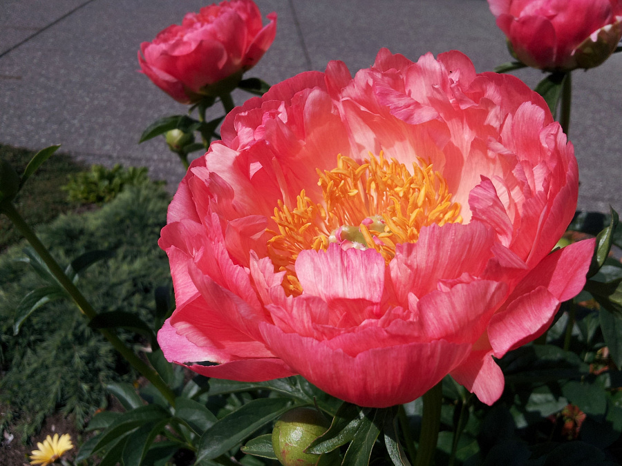 Саженцы пионов Корал Сансет (Coral Sunset) лучше всего растет на открытых хорошо освещенных участках. Взрослый куст вертикальный, побеги прочные. Высота многолетника достигает 80-100 см. Цветки имеют чашевидную форму, полумахровые, кораллово-розового цвета, с желтыми пыльниками. На цветоносах развивается по 1 цветку. Сорт саженцев пионов Корал Сансет очень зимостоек и переносит понижения температуры до -40°С. В поливе нуждается лишь во время сильной засухи. Многолетник обладает иммунитетом перед многими заболеваниями и вредителями.