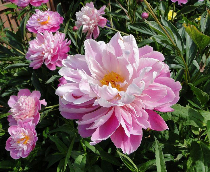 Пион травянистый Сюзетт относится к любимой всеми цветоводами молочноцветковой группе. Сорт был выведен селекционерами Франции в 1911 году. В высоту куст вырастает до 80 сантиметров. На прочных длинных стеблях распускаются крупные, махровые, розовидные цветы чистого розового цвета с более темным центром и многочисленными ярко-желтыми тычинками. Цветы имеют легкий аромат. Цветет Сюзетт очень обильно, используется в ландшафтном дизайне участков для создания эффектных групповых композиций, очень декоративно будет смотреться в одиночной посадке на зеленом газоне.