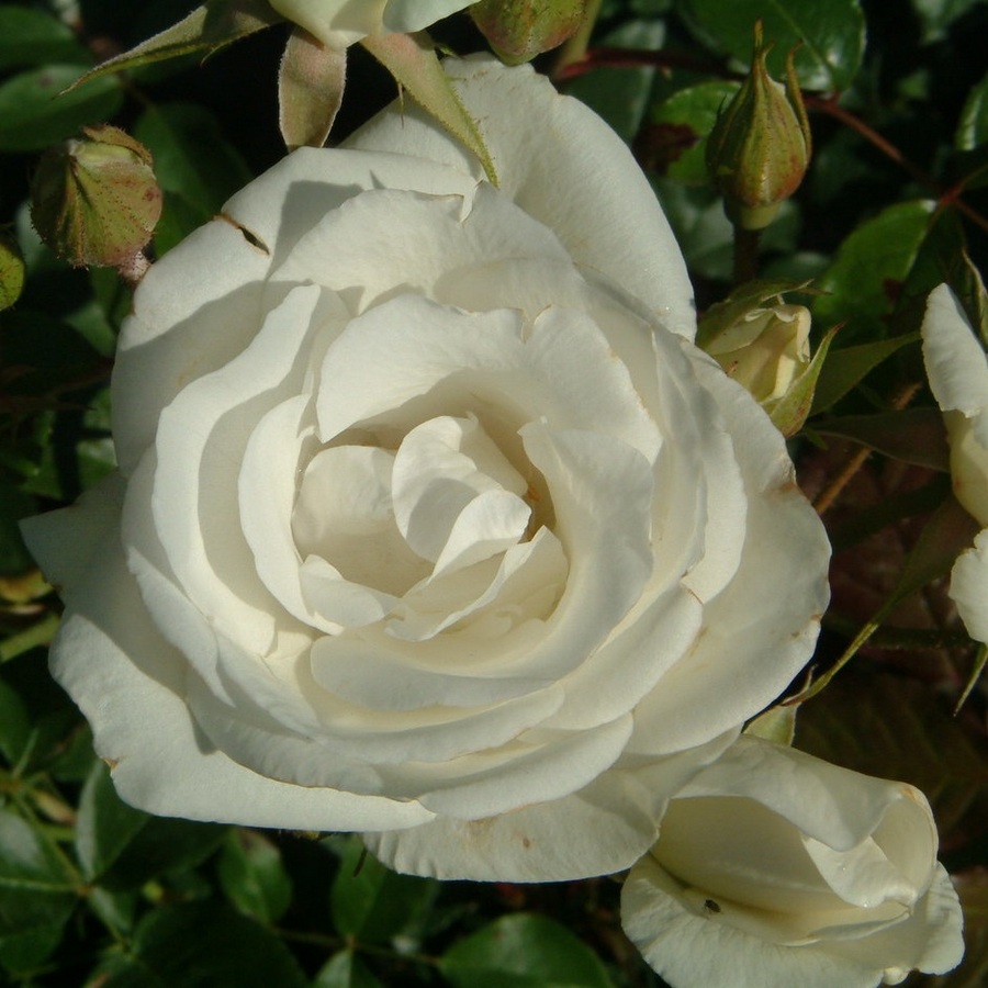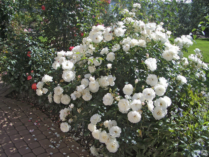 Саженцы розы сорта Шнеевитхен (Schneewittchen) славятся неприхотливостью и высокими эстетическими качествами. Эти растения используются при декорировании ландшафта и применяются для формирования живых изгородей. Особенности крупномера Шнеевитхен: высота до 150 см; ширина около 100 см; размер цветка – 6-7 см; цвет лепестков – белый (в холодную погоду немного розовеет); цветет кистями, на каждой из которых появляется от 3 до 15 бутонов. Саженцы розы сорта Шнеевитхен отлично переносят холод, а при своевременной профилактике успешно сопротивляются появлению мучнистой росы и черной пятнистости.