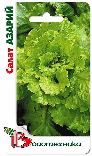 Семена салата "Азарий" (Azarij) высевают сразу на постоянное место в мае. Но чтобы получить ранний урожай, рекомендуется выращивать культуру рассадным способом. Растение невысокое, до 25 см. Представляет собой розетку листьев диаметром 35 см. Средняя масса достигает до 280 грамм. Листья крупные, зеленые, округлые, волокнистые по краю, в верхней части есть мелкие надрезы. Сорт отличается приятным вкусом, который напоминает молодой зеленый горошек. Используется в свежем виде для приготовления различных овощных салатов.