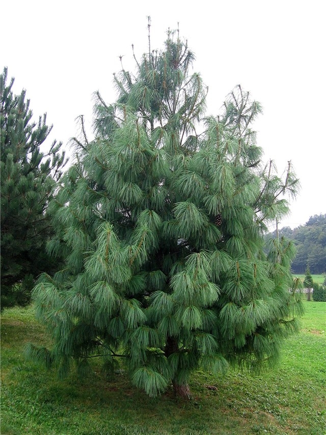 Саженцы Сосны гималайской Гриффита (Griffithii, Pinus wallichiana) – крупное вечнозеленое дерево, с годовым приростом до 60 сантиметров. Его высота – 30 метров. Крона пирамидальная, ее формирование начинается от земли, плотная, диаметром от 500 до 800 сантиметров. Уникальность сорта Гриффита в хвоинках серовато-зеленого окраса, серебристого оттенка, которые хорошо гнутся, длиной до 20 сантиметров. Иголочки собраны в пучках по 5 штук. Кора пепельно-серого оттенка. Шишки цилиндрической формы, до 25 сантиметров. Произрастает сосна Гриффита на любых почвах. Не терпит заболоченности. Зимоустойчива, светолюбива. Плохо переносит засуху, которая приводит к потере хвоинок.