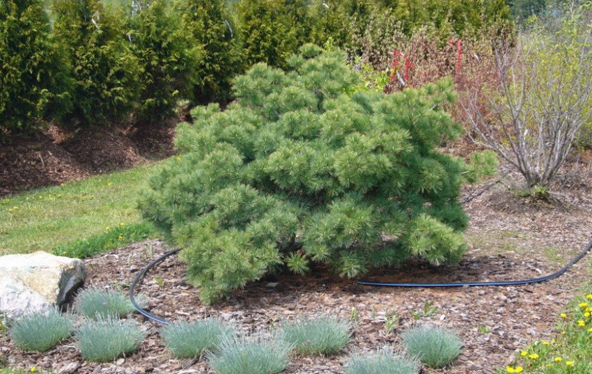 Саженцы сосны Веймутова Блю Шег (Blue Shag): декоративные шаровидные кроны карликового кустарника прямо светятся серебристо-зеленой хвоей. Габариты взрослого крупномера - до 1,5 м ширины и до 1,2 м высоты. Компактность сосны Веймутова Блю Шег позволяет использовать сорт в любых ландшафтных комбинациях. Хвоя очень длинная и мягкая, с синеватым отливом, растет пучками по 5 штук. Шишки длинные, конической формы, бледно-бурого оттенка. Достоинства: